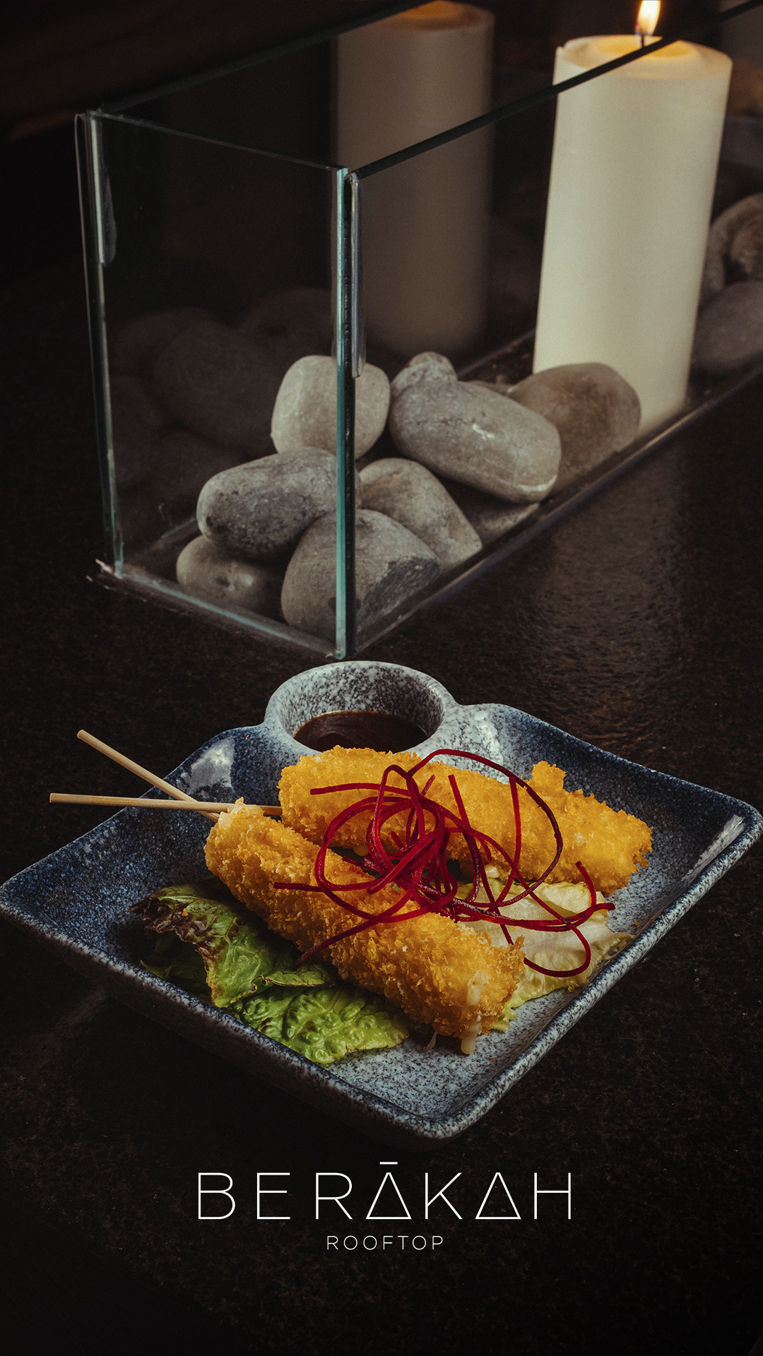 Queso gouda o camarón o plátano empanizado acompañado de salsa kushiage