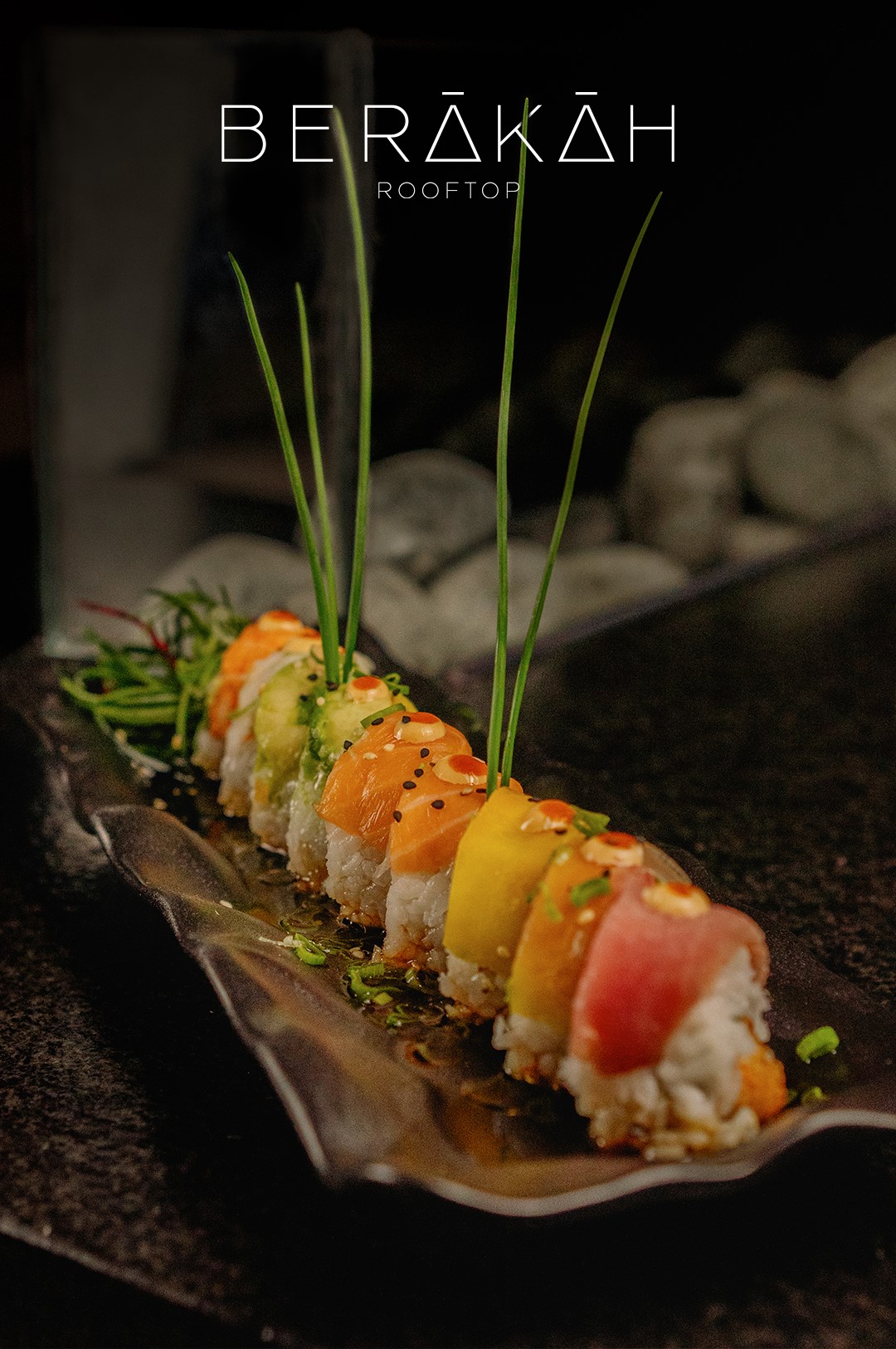 Envuelto en lámina de atún, relleno de aguacate, queso philadelphia, pepino y kanikama spicy en un espejo de salsa de naranja (yuzu) y con topping de atún